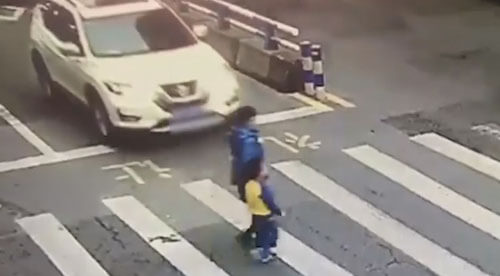 Жительница Чунцина (Китай), переходившая дорогу вместе с маленьким сыном, попала под машину.